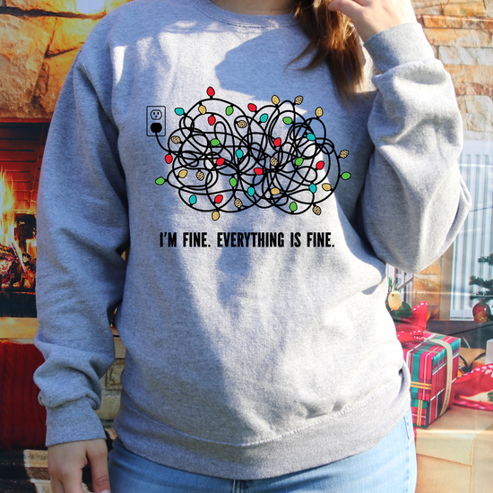 Everything is Fine tangled Christmas lights gray sweatshirt
