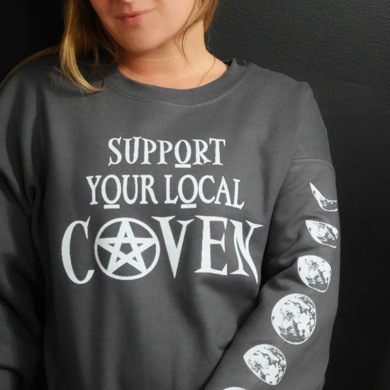Support Your Local Coven Crewneck with moon phases on sleeves